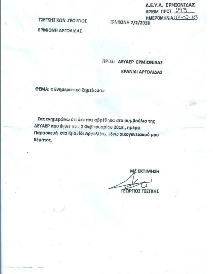 Εγώ ως Πρόεδρος του Δ.Σ. της Δ.Ε.Υ.Α.ΕΡ. και εκπρόσωπος των υπολοίπων μελών αναλαμβάνω δημόσια την ευθύνη, καθώς δεν το εντόπισα κατά την υπογραφή των αποφάσεων. Δεν μου ήταν όμως δυνατό να αφιερώσω χρόνο για τον λεπτομερή έλεγχο των αποφάσεων έως και των ονομάτων των συμβούλων που παρευρίσκονταν στη συνεδρίαση, δεδομένου του πλήθους των εργασιών της Δ.Ε.Υ.Α.ΕΡ. που βρίσκονται σε εξέλιξη (έργο Ολοκλήρωσης Αποχέτευσης Δικτύου Κρανιδίου, αντικαταστάσεις δικτύων ύδρευσης, ένταξη νέων έργων στο πρόγραμμα ΦΙΛΟΔΗΜΟΣ, λειτουργία βιολογικών καθαρισμών (Ε.Ε.Λ.), μεταβίβαση περιουσιακών στοιχείων πρώην Δήμου Ερμιόνης, ολοκλήρωση καταγραφής γεωτρήσεων και αδειοδότησή τους, σχεδιασμός μονάδων Αφαλάτωσης Κρανιδίου & Ερμιόνης).