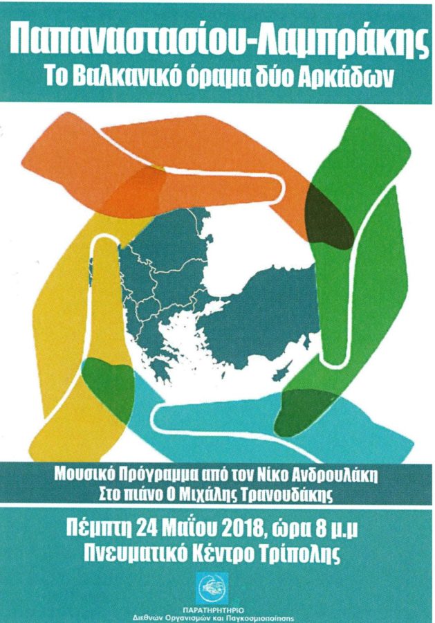 Την Πέμπτη 24 Μαϊου και ώρα 20.00 στο Πνευματικό Κέντρο Δήμου Τρίπολης, το Παρατηρητήριο Διεθνών Οργανισμών και Παγκοσμιοποίησης (ΠΑ.Δ.Ο.Π.) σε συνεργασία με το Δήμο Τρίπολης και  με αφορμή την ημέρα δολοφονίας του Γρηγ. Λαμπράκη (22 Μαΐου 1963) και στο πλαίσιο της Παγκόσμιας Εκστρατείας για τη δραστική μείωση των στρατιωτικών δαπανών, πραγματοποιεί εκδήλωση με το επίκαιρο θέμα : «Παπαναστασίου-Λαμπράκης: Το Βαλκανικό Όραμα δύο Αρκάδων».