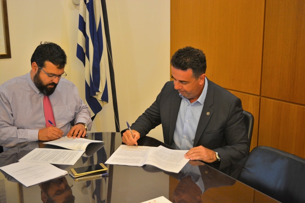 Ο Δήμαρχος Ναυπλιέων Δημήτρης Κωστούρος και ο Υφυπουργός Αθλητισμού Γιώργος Βασιλειάδης υπέγραψαν σήμερα την προγραμματική σύμβαση για την ενεργειακή αναβάθμιση του Ολυμπιακού Κολυμβητηρίου Ναυπλίου.