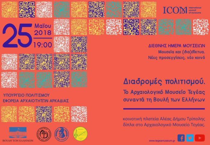 Η Εφορεία Αρχαιοτήτων Αρκαδίας και ο Δήμος Τρίπολης σας προσκαλούν στην εκδήλωση “Διαδρομές πολιτισμού. Το Αρχαιολογικό Μουσείο Τεγέας συναντά τη Βουλή των Ελλήνων” στο πλαίσιο εορτασμού της Διεθνούς Ημέρας Μουσείων 2018, που θα πραγματοποιηθεί την Παρασκευή 25 Μαΐου και ώρα 19:00 στην κοινοτική πλατεία Αλέας Δήμου Τρίπολης, δίπλα στο Αρχαιολογικό Μουσείο Τεγέας. Η εκδήλωση τελεί υπό την αιγίδα της Βουλής των Ελλήνων.