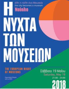Το Πολεμικό Μουσείο-Παράρτημα Ναυπλίου θα φιλοξενήσει στις 21:00 στον προαύλιο χώρο του τον μουσικό Στράτο Διαμαντή σε δικά του τραγούδια και διασκευές μουσικής από τη Μεσόγειο. Οι επισκέπτες θα έχουν την ευκαιρία, εκτός από την ξενάγηση στη μόνιμη έκθεση του Μουσείου, να επισκεφθούν και την περιοδική έκθεση «ΜΑΙΡΑ», της εικαστικού Ιωάννας Τσαχτσιρλή.