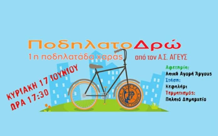 Μια πρωτότυπη καμπάνια για την επιστροφή του ποδηλάτου στη σύγχρονη κοινωνία ως μέσον μεταφοράς και όχι μόνο, γίνεται στα πλαίσια της 1ης Ποδηλατάδας Χαράς, η οποία θα πραγματοποιηθεί την Κυριακή 17 Ιουνίου και ώρα 17:30 απο τον Α.Σ. ΑΓΕΥΣ με την υποστήριξη του Ν.Π.Δ.Δ. Κοινωνική Μέριμνα & Αθλητισμός του Δήμου Άργους Μυκηνών .