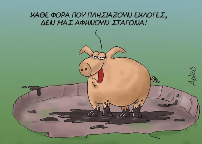 Συναλλαγή, διαπλοκή, μίζες, φωτογραφικές διατάξεις, κρυφές συμφωνίες με το κλείσιμο τού ματιού, διαφθορά ενίοτε και μέχρις εξαχρείωσης, έργα βιτρίνας, διασπάθιση δημοσίου χρήματος, χοροί και πανηγύρια, τραπεζώματα, λαμπιόνια, ρωμαϊκές φιέστες, ασυνέπεια, προσποίηση, ατιμωρησία.