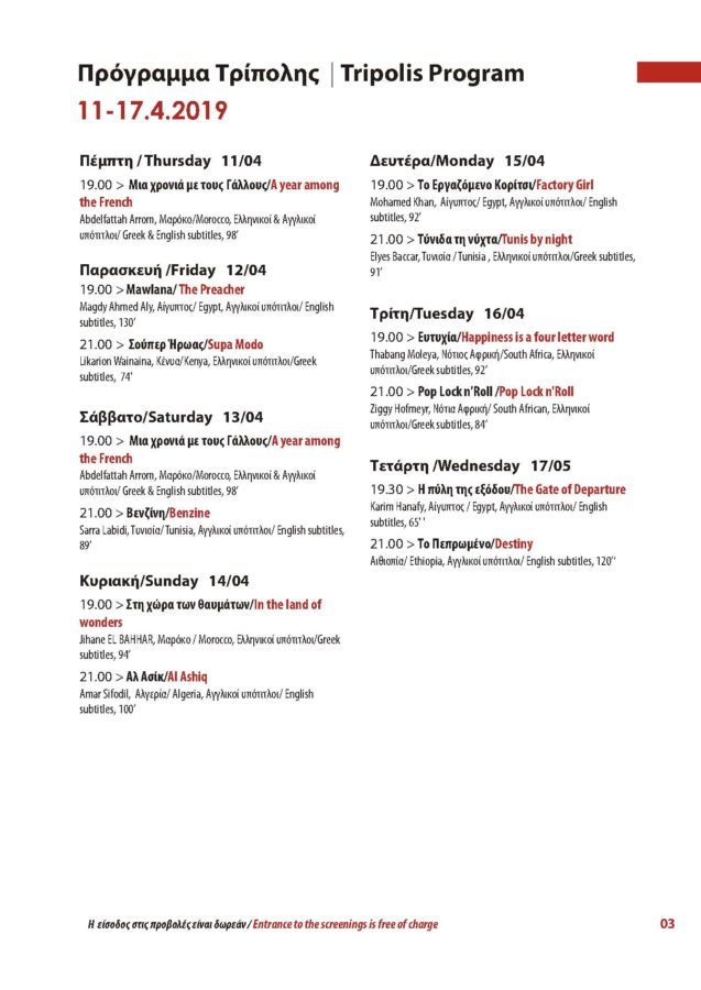 Η Αφρική μας προσκαλεί να μυηθούμε στις μαγευτικές ιστορίες των ανθρώπων της και να ανακαλύψουμε τα μυστικά της: 12 ταινίες από 7 χώρες (Αίγυπτος, Αιθιοπία, Αλγερία, Κένυα, Μαρόκο, Νότια Αφρική και Τυνησία) συνθέτουν την Εβδομάδα Αφρικανικού Κινηματογράφου και μας αποκαλύπτουν περισσότερο ή λιγότερο γνωστές πλευρές της αγαπημένης ηπείρου, καλώντας το ελληνικό κοινό να ανακαλύψει το ανεξερεύνητο αφρικανικό κινηματογραφικό σύμπαν. Κάθε χρόνο, η έναρξη του αφιερώματος εκπροσωπείται από μια αφρικανική χώρα και φέτος την αυλαία ανοίγει το Μαρόκο με την κωμωδία «Μια χρονιά με τους Γάλλους»