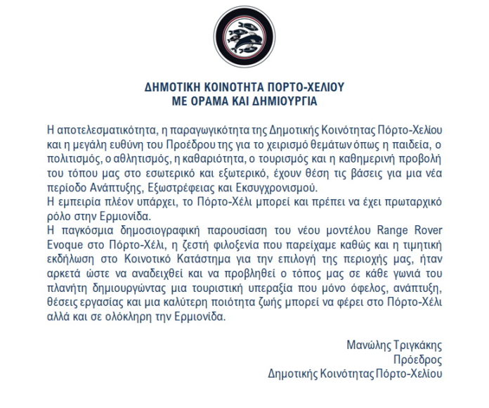 Η Ελλάδα επιλέχθηκε από τη Land Rover ως Κράτος και πιο συγκεκριμένα το Πόρτο-Χέλι Αργολίδας, ως τόπος για την παγκόσμια δημοσιογραφική παρουσίαση του νέου μοντέλου Range Rover Evoque. Η παρουσίαση τους ξεκίνησε στις 9 Μαρτίου και ολοκληρώθηκε στις 4 Απριλίου.