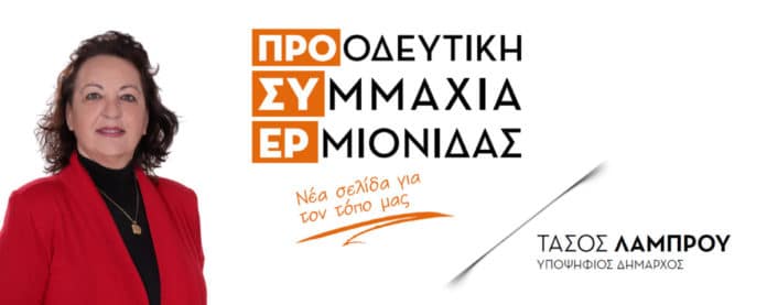 στις επερχόμενες δημοτικές εκλογές του Μαΐου 2019, αποφάσισα να είμαι και πάλι υποψήφια δημοτική σύμβουλος με τον συνδυασμό της “Προοδευτικής Συμμαχίας Ερμιονίδας” με υποψήφιο Δήμαρχο τον αγαπητό από ετών φίλο μου Τάσο Λάμπρου, τον οποίο εκτιμώ για την μαχητικότητά του, την ειλικρίνειά του και την τιμιότητά του.