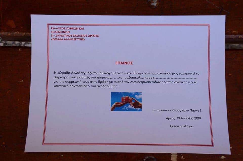 Την Παρασκευή 19 Απριλίου, οι μαθητές, οι εκπαιδευτικοί και οι γονείς του 3ου Δημοτικού Σχολείου Άργους, για ακόμη μια χρονιά, έκαναν τον εθελοντισμό και την αλληλεγγύη πράξη.