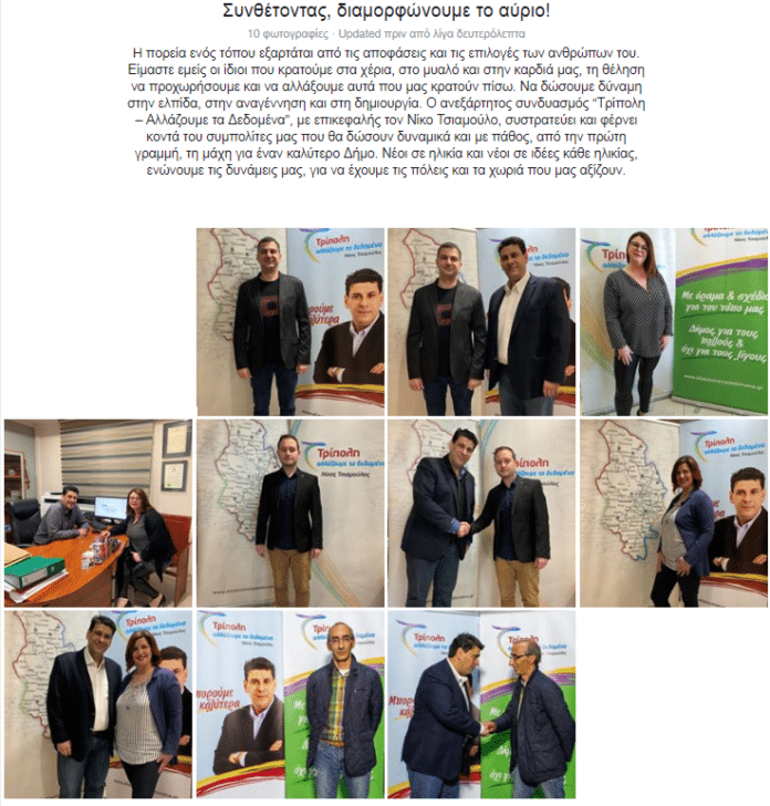 Ο ανεξάρτητος συνδυασμός “Τρίπολη – Αλλάζουμε τα Δεδομένα”, με επικεφαλής τον Νίκο Τσιαμούλο, συστρατεύει και φέρνει κοντά του συμπολίτες μας που θα δώσουν δυναμικά και με πάθος, από την πρώτη γραμμή, τη μάχη για έναν καλύτερο Δήμο. Νέοι σε ηλικία και νέοι σε ιδέες κάθε ηλικίας, ενώνουμε τις δυνάμεις μας, για να έχουμε τις πόλεις και τα χωριά που μας αξίζουν.