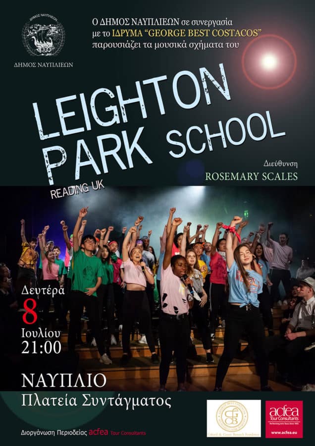 Ο Δήμος Ναυπλιέων σε συνεργασία με το ίδρυμα “George best Costacos” παρουσιάζουν τα μουσικά σχήματα του Leighton Park School, υπό την Διεύθυνση ROSEMARY SCALES, την Δευτέρα 8 Ιουλίου στις 9 το βράδυ στην πλατεία Συντάγματος.