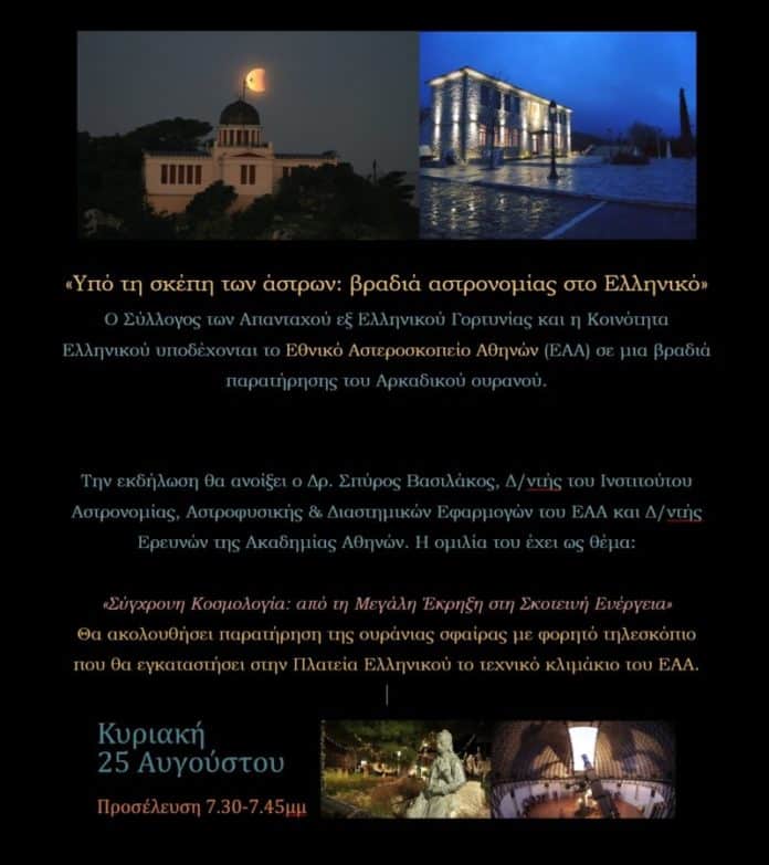 Ο Σύλλογος των Απανταχού εξ Ελληνικού Γορτυνίας και η Κοινότητα Ελληνικού, υπό την επιστημονική επιμέλεια του Εθνικού Αστεροσκοπείου Αθηνων, διοργανώνουν βραδιά αστρονομίας την Κυριακή 25 Αυγούστου, ώρα 19:45, στην κεντρική πλατεία του Ελληνικού.