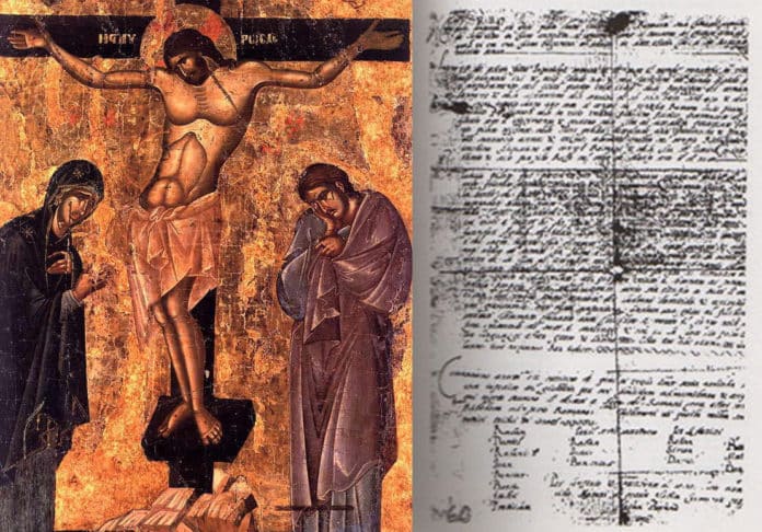 Εγώ Πόντιος Πιλάτος, ηγεμών δια της βασιλείας των Ρωμαίων, επί του Πραιτωρίου της αρχιηγεμονίας, κρίνω και κατακρίνω και καταψηφίζω εις θάνατον σταυρικόν τον Ιησού λεγόμενον υπό του πλήθους Χριστόν, και από πατρίδος Γαλιλαίας, άνθρωπον στασιώτη κατά τον Νόμο του Μωσαϊκού και εναντίον του μεγαλοπρεπούς βασιλέως Ρωμαίων Τιβερίου Καίσαρος και ορίζω και αποφαίνομαι τον θάνατον αυτού σταυρικόν μετά των άλλων κατά το συνήθες των καταδίκων, επεί συνοίθρησεν αυτός πλήθος ανθρώπων πλουσίων και φτωχών, ουκ έπαυσε θορύβους εγείρων, ενοχλείν την Ιουδαίαν ποιών εαυτόν Υιόν Θεού και βασιλέα της Ιερουσαλήμ, απειλών φθοράν της Ιερουσαλήμ και του Ιερού Ναού, απαρνούμενος τον φόρον του Καίσαρος και τολμήσας εισελθείν μετά βαϊων θριαμβευτής και πλείστου όχλου ώσπερ τις Ρήξ εντός της πόλεως Ιερουσαλήμ ως τον Ι. Ναόν και διορίζομεν τον ημέτερον πρώτον εκατόνταρχον Κουϊντον Κορνήλιον περιάξαι τούτον παρρησία εις την χώραν Ιερουσαλήμ δεδεμένον, μαστιζόμενον και ενδεδυμένον πορφύραν, εστεφανωμένον ακάνθινω στεφάνω και βαστάζοντα τον ίδιον σταυρόν επί ώμου αυτού, ίνα ει παράδειγμα τοις άλλοις και πάσι τοις κακοποιοίς μεθ’ ού βούλομαι συνάγεσθαι δύο ληστάς φονείς και εξέρχεσθαι δια της πύλης Γιαμπαρόλας, της νυν Αντωνιανής, αναχθήναι δε Αυτόν τον Χριστόν παρρησία επί το όρος των κακούργων ονόματι Κολβάριον, ούτινος σταυρωθέντος μείναι το σώμα εν τω σταυρώ εις κοινόν θεώρημα πάντων των κακούργων, και άνω του σταυρού τίτλου τεθήναι γεγραμμένου τρισί γλώσσας τον ΙΗΣΟΥΣ ΑΛΟΝ Ο ΙΛΗΣ ΙΟΔΑΜ (Εβραϊστί) ΙΗΣΟΥΣ Ο ΝΑΖΩΡΑΙΟΣ ΒΑΣΙΛΕΥΣ ΙΟΥΔΑΙΩΝ (Ελληνιστί) ΙΕΖΟΥΣ ΝΑΖΩΡΑΙΟΥΣ ΡΕΞ ΙΟΥΔΑΙΟΡΟΥΜ (Ρωμαϊστί).