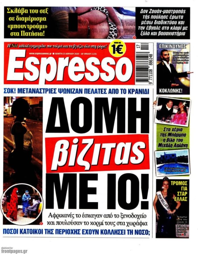 Ένα πρωτοσέλιδο γεμάτο μισογυνισμό, ρατσιστικό παραλήρημα που υποκινεί το μίσος και ρίχνει λάσπη στην περιοχή της Ερμιονίδας κυκλοφόρησε η εφημερίδα Espresso. Τσουβαλιάζει ανερυθρίαστα όλους τους κάτοικους του εν λόγω δήμου, ότι δήθεν επιδίδονταν σε ακολασίες ολημερίς στα χωράφια με Αφρικανές πρόσφυγες και μετανάστριες προετοιμάζοντας το έδαφος για ένα “κυνήγι μαγισσών”, ξεπλένοντας με αυτό τον τρόπο την ολιγωρία του ΕΟΔΥ, την ανυπαρξία του συστήματος Υγείας στο Κρανίδι, χωρίς γιατρούς – ασθενοφόρα, όπως περιέγραψε ο Κώστας Πρώιμος σε χθεσινό του άρθρο, στο μείζονος σημασίας ζήτημα του ξενοδοχείου “Γαλαξίας”. Πρόκειται ξεκάθαρα για μια προσπάθεια να επιρριφθούν οι ευθύνες στην τοπική κοινωνία.