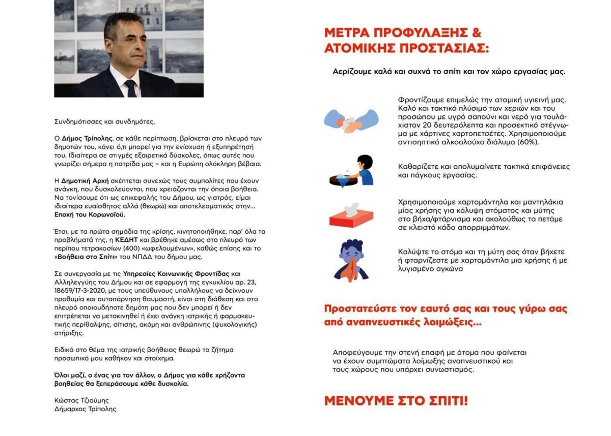 Ο Δήμος Τρίπολης επεκτείνοντας τη δράση ενημέρωσης για την αποφυγή της εξάπλωσης του κορωνοϊού και για την καλύτερη ενημέρωση των συμπολιτών μας που δεν έχουν εξοικείωση με τη τεχνολογία μοίρασε χθες ενημερωτικά φυλλάδια στα χωριά μας. Με το φυλλάδιο αυτό οι συνδημότες μας ενημερώνονται για όλα τα τηλέφωνα του Κέντρου Υποστήριξης των αδυνάτων, υπενθυμίζονται οι βασικοί κανόνες υγιεινής και τέλος αναγράφονται αναλυτικά όλες οι οδηγίες μετακίνησης.