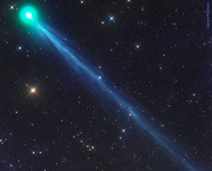 Ο νέος κομήτης Swan (C/2020 F8) ανακαλύφθηκε στις 11 Απριλίου 2020, από παρατηρήσεις που πάρθηκαν από την διαστημική συσκευή SOHO (Solar Heliospheric Observer). Αυτήν τη περίοδο φαίνεται με τηλεσκόπια από το νότιο ημισφαίριο της Γης. Στις 27 Μαΐου θα φτάσει στην πλησιέστερη απόσταση του από τον Ήλιο. Παρότι η λαμπρότητα των κομητών είναι δύσκολο να προβλεφθεί, κάποια μοντέλα υπολογίζουν ότι μπορεί να γίνει ορατός και με γυμνό μάτι εντός του Ιουνίου.Η παρακάτω φωτογραφία τραβήχτηκε στην Namibia της Νότιας Αφρικής στα μέσα Απριλίου. Διακρίνουμε την λαμπερή πράσινη κόμη και λεπτομέρειες στην μακριά γαλάζια ουρά ιόντων του κομήτη.