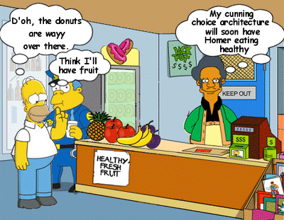 Η αρχιτεκτονική των επιλογών στον τόπο ζωής (σχολείο, εργασία, δημόσια κτίρια-υπηρεσίες κα) μπορεί και πρέπει να απασχολήσει φορείς άσκησης πολιτικών. Σημαντική είναι και η γνωστική παρώθηση (καμπάνιες, ενημερώσεις) που θα βοηθήσουν τους πολίτες να επιλέγουν σωστές τροφές στο σπίτι. Όμως, προηγείται το πλαίσιο, προηγούνται οι επιλογές που δίδονται στο περιβάλλον της ζωής μας. Αυτό χρειάζεται δεσμεύσεις, νόρμες, όχι πολύ φαντασία τελικά..