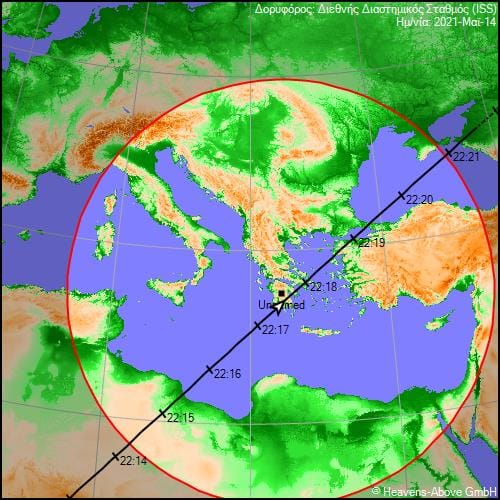 Απόψε στις 22.15 θα μπορέσουμε να παρατηρήσουμε μία πραγματικά εντυπωσιακή διέλευση του Διεθνούς Διαστημικού Σταθμού (ISS) ακριβώς πάνω από τη Μεσσηνία, Λακωνία, Αρκαδία, Αργολίδα και Αττική. Ο ISS θα είναι ορατός από όλη την Ελλάδα αλλά σε διαφορετικά ύψη. Η διέλευση θα ξεκινήσει νοτιοδυτικά. Πολύ καλή ευκαιρία για να δούμε τον ουρανό με παιδιά καθώς στο μεγαλύτερο μέρος της χώρας προβλέπεται καθαρή νύχτα.