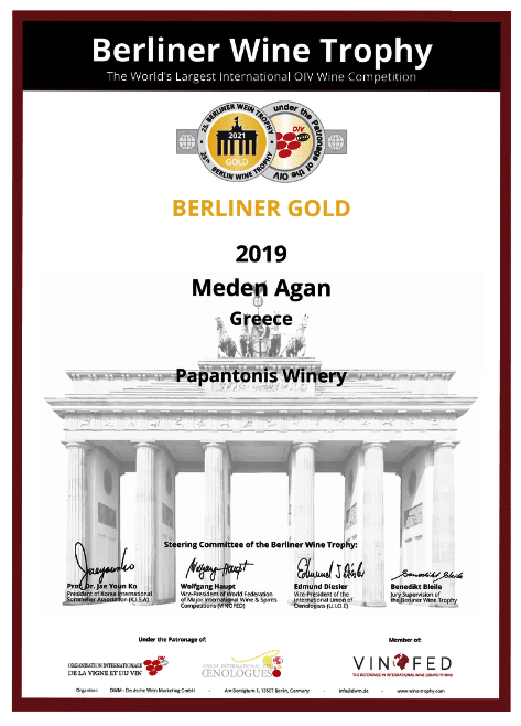 Στο διεθνή διαγωνισμό Berliner Wine Trophy το κρασί της οινοποιίας ΠΑΠΑΝΤΩΝΗ που φέρει την εμβληματική ετικέτα “ΜΗΔΕΝ ΑΓΑΝ 2019” απέσπασε χρυσό μετάλλιο! Το ΜΗΔΕΝ AΓΑΝ που προήρθε από τον εξαιρετικό τρύγο της Νεμέας 2019 παλαίωσε σε Γαλλικά δρύινα βαρέλια για 14 μήνες και οινοποιήθηκε από τον πολύπειρο οινολόγο Χρήστο Πέππα στον οποίο ανήκει μεγάλος μέρος της ανωτέρω επιβράβευσης.