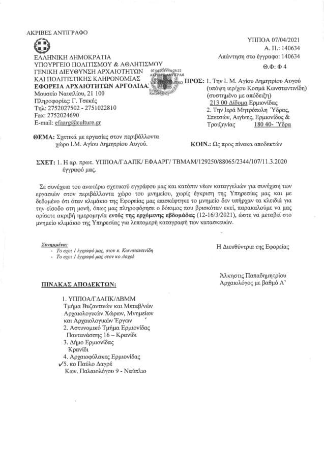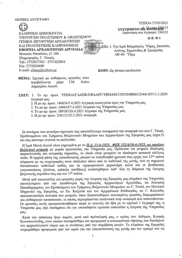 Αυτό όμως που εκπλήττει είναι, πως οι αρμόδιες υπηρεσίες δεν αντελήφθηκαν επί δύο χρόνια και πλέον ότι διενεργούντο ΠΑΡΑΝΟΜΑ εκτεταμένες εργασίες εντός της Μονής Αυγού, που έχει κηρυχθεί με το Π.Δ. 11-6-1925 ΦΕΚ 152/Α/16-6-1925 ως προέχον Βυζαντινό Μνημείο και αναφέρομαι σε όλες τις υπηρεσίες καθώς και στους Δημοτικούς Συμβούλους του Δήμου Ερμιονίδας.