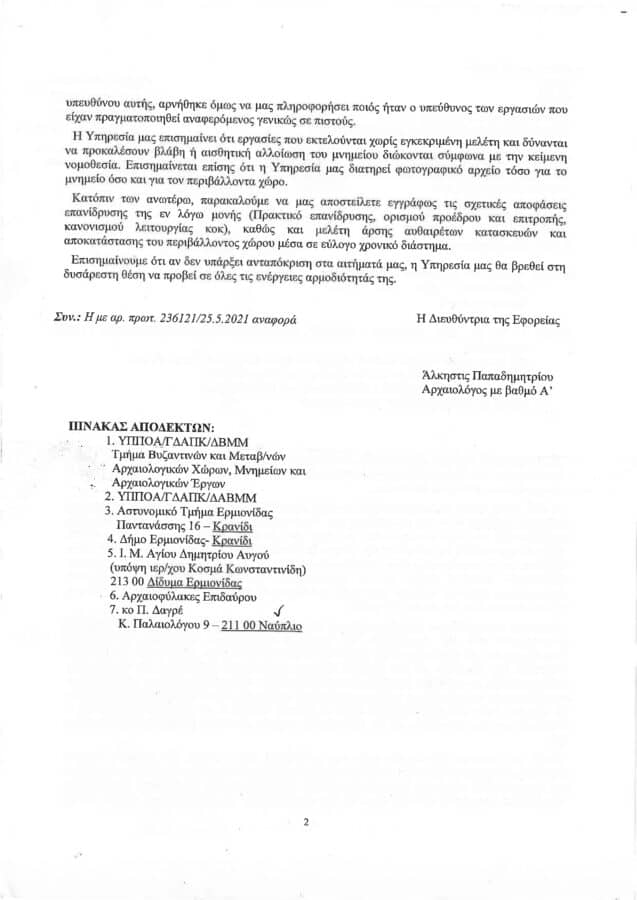 Καταπέλτης το πόρισμα της Διευθύντριας της Εφορίας Αρχαιοτήτων Αργολίδας κ. Άλκηστις Παπαδημητρίου.