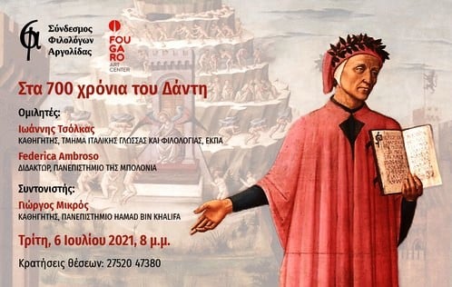 Τιμώντας τα 700 χρόνια από τον θάνατο του «Ομήρου της Χριστιανοσύνης» Δάντη Αλιγκέρι (Dante Alighieri), ο Πολυχώρος Πολιτισμού ΦΟΥΓΑΡΟ και ο Σύνδεσμος Φιλολόγων Αργολίδας διοργανώνουν εσπερίδα για τον σπουδαίο αυτόν Ευρωπαίο πνευματικό άνθρωπο.