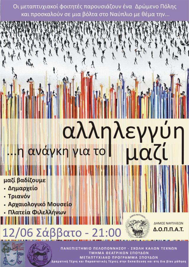 Το Μεταπτυχιακό Πρόγραμμα Σπουδών του Τμήματος Θεατρικών Σπουδών του Πανεπιστημίου Πελοποννήσου σε συνεργασία με τον Δημοτικό Οργανισμό Πολιτισμού – Περιβάλλοντος – Αθλητισμού – Τουρισμού (ΔΟΠΠΑΤ) του Δήμου Ναυπλιέων παρουσιάζουν δρώμενο πόλης με θέμα: «Αλληλεγγύη ….. η ανάγκη για το μαζί»