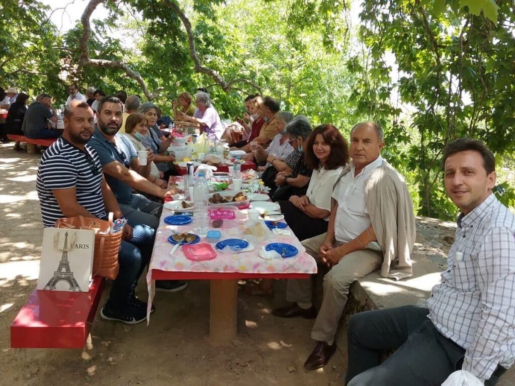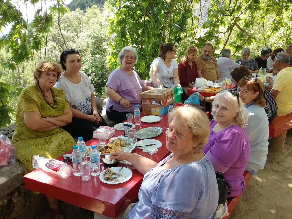 Περπατώντας σε γνώριμο πια περιβάλλον βρισκόμαστε κάτω από τον πελώριο πλάτανο, στην αυλή του μοναστηριού, που μπορεί να φιλοξενήσει πολλούς επισκέπτες στα χτιστά τραπέζια και καθίσματα. Όλοι μας απολαμβάνουμε τα εδέσματα που ετοιμάσαμε και οι μοναχές μας προσφέρουν την καθιερωμένη μακαρονάδα. Δίπλα μας η χαράδρα του Σύθα με λίγα δυστυχώς νερά! Παρόλο την έλλειψη νερού είναι μαγεία να αισθάνεσαι τη δροσιά στο σώμα σου κάτω από τα πανύψηλα δέντρα! Η Κυλλήνη, που πήρε τ` όνομά της από το κύλλος= λάκκος, γέννησε έναν θεό, τον ψυχοπομπό Ερμή, δημιούργησε έναν άγιο μέσα στις «λάκκες», τα έλατά της, τα σπήλαιά της και συνεχίζει να χαρίζει ζωή και δροσιά στους επισκέπτες της.