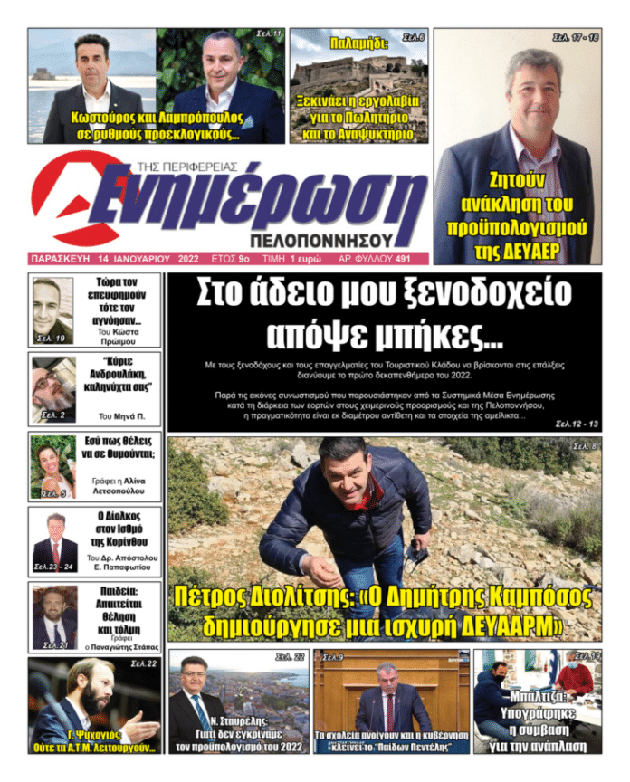 Πρωτοσέλιδα Πρωτοσέλιδο 14 Ιανουαρίου 2022 Από Ενημέρωση Πελοποννήσου 13 Ιανουαρίου 2022 FacebookTwitterViberWhatsApp Ακολουθήστε την Ενημέρωση Πελοποννήσου στο Facebook Αποκλειστικές Έρευνες – Συνεντεύξεις και ΆρθραΕιδήσεις από: Ναύπλιο – Άργος – Ερμιονίδα – Τρίπολη – Κορινθία – Αθλητικά – Γερανιός-2xalkidisfrontlabrou ΑΞΙΖΕΙ ΝΑ ΔΙΑΒΑΣΕΤΕ Featured 2 ΕΛΤΑ Αργολίδας: Κενές απαντήσεις και καμία δέσμευση από το Υπουργείο 17 Απριλίου 2026 Featured 2 Τριήμερο Θεατροπαιδαγωγικών δράσεων στο Ναύπλιο 17 Απριλίου 2026 Featured 2 “Σεληνιακό τοπίο” ο δρόμος Τρίπολης – Στεμνίτσας 17 Απριλίου 2026 Featured 2 Υπεύθυνες οι υπηρεσίες της Περιφέρειας για τον κάμπο των Διδύμων 17 Απριλίου 2026 Αργολίδα Ημερίδα στο Ναύπλιο: Σεξουαλική Κακοποίηση Ατόμων με Αναπηρία 17 Απριλίου 2026 Ελλάδα “Επείγουσα ανάγκη για μέτρα ενίσχυσης των ΑμεΑ” 17 Απριλίου 2026 Αργολίδα ΚΚΕ: Μεγάλη Εκδήλωση στο Ναύπλιο για την Ακροναυπλία 16 Απριλίου 2026 Αργολίδα Ημερίδα Επιμελητηρίου Αργολίδας: “Παράγουμε στην Ελλάδα” 16 Απριλίου 2026 Αργολίδα Γονίδια και Επιλογές: Εκδήλωση του ΚΕΣ στο Ναύπλιο για τη Γενετική 16 Απριλίου 2026 Τελευταίες ειδήσεις Αργολίδα Ημερίδα στο Ναύπλιο: Σεξουαλική Κακοποίηση Ατόμων με Αναπηρία 17 Απριλίου 2026 Ελλάδα “Επείγουσα ανάγκη για μέτρα ενίσχυσης των ΑμεΑ” 17 Απριλίου 2026 Αργολίδα ΚΚΕ: Μεγάλη Εκδήλωση στο Ναύπλιο για την Ακροναυπλία 16 Απριλίου 2026 Αργολίδα Ημερίδα Επιμελητηρίου Αργολίδας: “Παράγουμε στην Ελλάδα” 16 Απριλίου 2026 Αργολίδα Γονίδια και Επιλογές: Εκδήλωση του ΚΕΣ στο Ναύπλιο για τη Γενετική 16 Απριλίου 2026 Περιφέρεια 14 συλλήψεις σε Αργολίδα, Κορινθία & Λακωνία 16 Απριλίου 2026 Περιφέρεια Σοκαριστικά ευρήματα στον Πάρνωνα: 95 δηλητηριασμένα δολώματα και ένας νεκρός σκύλος 16 Απριλίου 2026 Αθλητισμός Ο παλμός του μπάσκετ χτυπά δυνατά στην Τρίπολη 16 Απριλίου 2026 Τα πιο δημοφιλη Υπεύθυνες οι υπηρεσίες της Περιφέρειας για τον κάμπο των Διδύμων Featured 2 17 Απριλίου 2026 Όταν ο Τόνι Πινέλι συνάντησε τον Δημήτρη Κουρούνη Άρθρα 17 Φεβρουαρίου 2020 ΕΛΤΑ Αργολίδας: Κενές απαντήσεις και καμία δέσμευση από το Υπουργείο Featured 2 17 Απριλίου 2026 Πανικόβλητος συκοφάντης ο Δήμαρχος Γεωργόπουλος Άρθρα 10 Απριλίου 2026 Μούχλι Αρκαδίας: Η εγκατάλειψη της ιστορικής καστροπολιτείας Αρκαδία 15 Απριλίου 2026 Αρχική σελίδα