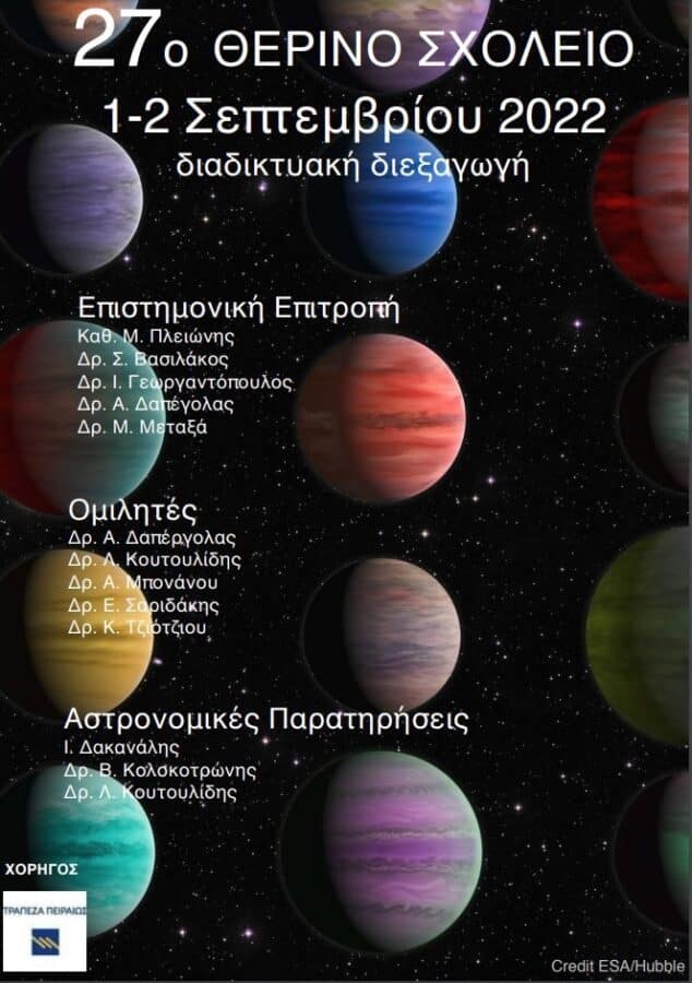 Στο πλαίσιο των Εκπαιδευτικών Δράσεων του Εθνικού Αστεροσκοπείου Αθηνών διοργανώθηκε διαδικτυακά στις 1 και 2 Σεπτεμβρίου 2022 θερινό Σχολείο, με θέμα «Το Σύμπαν, και οι τελευταίες ανακαλύψεις», με την ευγενική χορηγία της Τράπεζας Πειραιώς.