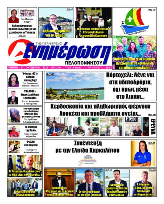 Πρωτοσέλιδα Πρωτοσέλιδο 27 Οκτωβρίου 2022 Από Ενημέρωση Πελοποννήσου 26 Οκτωβρίου 2022 FacebookTwitterViberWhatsApp Ακολουθήστε την Ενημέρωση Πελοποννήσου στο Facebook Αποκλειστικές Έρευνες – Συνεντεύξεις και ΆρθραΕιδήσεις από: Ναύπλιο – Άργος – Ερμιονίδα – Τρίπολη – Κορινθία – Αθλητικά – Γερανιός-2xalkidisfrontlabrou ΑΞΙΖΕΙ ΝΑ ΔΙΑΒΑΣΕΤΕ Featured 2 ΕΛΤΑ Αργολίδας: Κενές απαντήσεις και καμία δέσμευση από το Υπουργείο 17 Απριλίου 2026 Featured 2 Τριήμερο Θεατροπαιδαγωγικών δράσεων στο Ναύπλιο 17 Απριλίου 2026 Featured 2 “Σεληνιακό τοπίο” ο δρόμος Τρίπολης – Στεμνίτσας 17 Απριλίου 2026 Featured 2 Υπεύθυνες οι υπηρεσίες της Περιφέρειας για τον κάμπο των Διδύμων 17 Απριλίου 2026 Αργολίδα Ημερίδα στο Ναύπλιο: Σεξουαλική Κακοποίηση Ατόμων με Αναπηρία 17 Απριλίου 2026 Ελλάδα “Επείγουσα ανάγκη για μέτρα ενίσχυσης των ΑμεΑ” 17 Απριλίου 2026 Αργολίδα ΚΚΕ: Μεγάλη Εκδήλωση στο Ναύπλιο για την Ακροναυπλία 16 Απριλίου 2026 Αργολίδα Ημερίδα Επιμελητηρίου Αργολίδας: “Παράγουμε στην Ελλάδα” 16 Απριλίου 2026 Αργολίδα Γονίδια και Επιλογές: Εκδήλωση του ΚΕΣ στο Ναύπλιο για τη Γενετική 16 Απριλίου 2026 Τελευταίες ειδήσεις Αργολίδα Ημερίδα στο Ναύπλιο: Σεξουαλική Κακοποίηση Ατόμων με Αναπηρία 17 Απριλίου 2026 Ελλάδα “Επείγουσα ανάγκη για μέτρα ενίσχυσης των ΑμεΑ” 17 Απριλίου 2026 Αργολίδα ΚΚΕ: Μεγάλη Εκδήλωση στο Ναύπλιο για την Ακροναυπλία 16 Απριλίου 2026 Αργολίδα Ημερίδα Επιμελητηρίου Αργολίδας: “Παράγουμε στην Ελλάδα” 16 Απριλίου 2026 Αργολίδα Γονίδια και Επιλογές: Εκδήλωση του ΚΕΣ στο Ναύπλιο για τη Γενετική 16 Απριλίου 2026 Περιφέρεια 14 συλλήψεις σε Αργολίδα, Κορινθία & Λακωνία 16 Απριλίου 2026 Περιφέρεια Σοκαριστικά ευρήματα στον Πάρνωνα: 95 δηλητηριασμένα δολώματα και ένας νεκρός σκύλος 16 Απριλίου 2026 Αθλητισμός Ο παλμός του μπάσκετ χτυπά δυνατά στην Τρίπολη 16 Απριλίου 2026 Τα πιο δημοφιλη Υπεύθυνες οι υπηρεσίες της Περιφέρειας για τον κάμπο των Διδύμων Featured 2 17 Απριλίου 2026 Όταν ο Τόνι Πινέλι συνάντησε τον Δημήτρη Κουρούνη Άρθρα 17 Φεβρουαρίου 2020 Πανικόβλητος συκοφάντης ο Δήμαρχος Γεωργόπουλος Άρθρα 10 Απριλίου 2026 ΕΛΤΑ Αργολίδας: Κενές απαντήσεις και καμία δέσμευση από το Υπουργείο Featured 2 17 Απριλίου 2026 Μούχλι Αρκαδίας: Η εγκατάλειψη της ιστορικής καστροπολιτείας Αρκαδία 15 Απριλίου 2026 Αρχική σελίδα