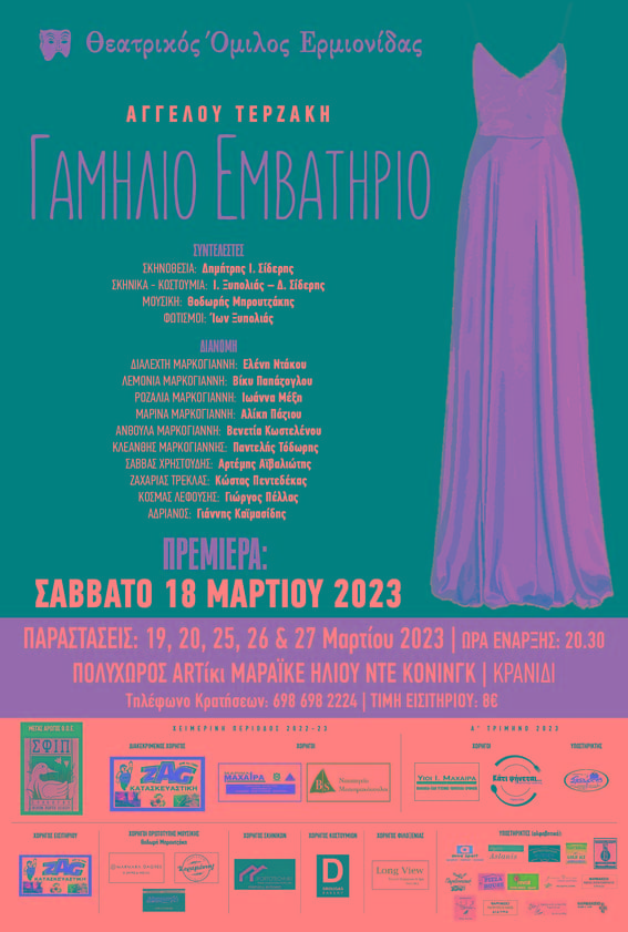Ο Θεατρικός Όμιλος Ερμιονίδας, συνεχίζοντας δυναμικά την παρουσία του στη θεατρική σκηνή και αυτή τη χρονιά με τη νέα του παραγωγή «Γαμήλιο Εμβατήριο» του Άγγελου Τερζάκη, σας προσκαλεί στο Θέατρο ΑΡΤΙΚΙ για τρείς ακόμη παραστάσεις, το τριήμερο 25, 26 & 27 Μαρτίου 2023
