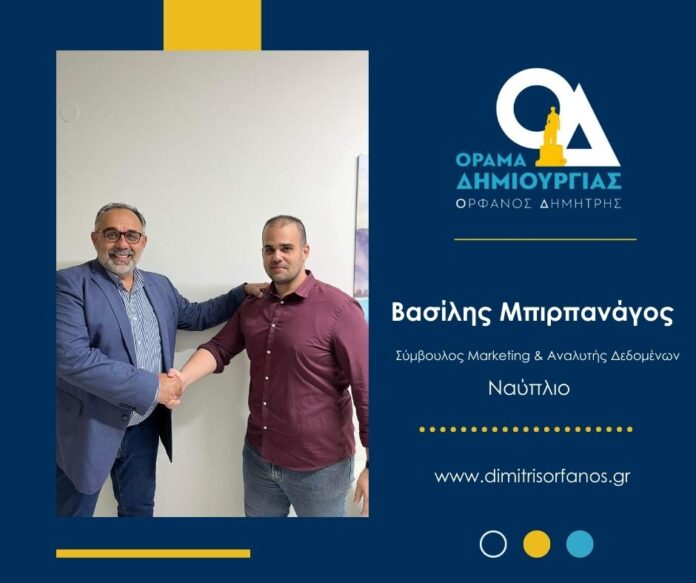 Καλωσορίζω στην παράταξή μας τον Βασίλη Μπιρπανάγο, Σύμβουλο marketing & αναλυτή δεδομένων και του εύχομαι καλή επιτυχία! Καλωσήλθες στην παράταξή μας! Στόχος μας είναι να έχουμε στο συνδυασμό μας νέους ανθρώπους με όραμα τη ριζική αλλαγή του Δήμου μας αναφέρει ο υποψήφιος Δήμαρχος Ναυπλιέων Δημήτρης Ορφανός.