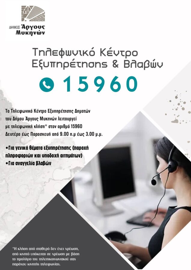 Το Τηλεφωνικό Κέντρο Εξυπηρέτησης Δημοτών του Δήμου Άργους Μυκηνών λειτουργεί με τηλεφωνική κλήση στον αριθμό 15960.