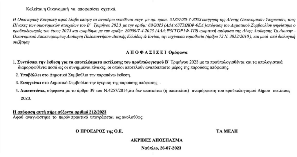 Επανέρχομαι στην Έκθεση Αποτελεσμάτων Εκτέλεσης Προϋπολογισμού του Β΄ Τριμήνου του έτους 2023, που δημοσιεύτηκε στο πρόγραμμα Διαύγεια με ΑΔΑ: ΨΘΗ5ΩΚΦ-Θ39. Η Έκθεση αυτή περιέχεται στην υπ.’ Αρ. 212/2023 Απόφαση της Οικονομικής Επιτροπής.