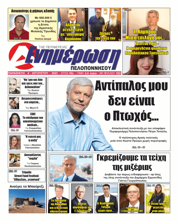 Πρωτοσέλιδα Πρωτοσέλιδο 4 Αυγούστου 2023 Από Ενημέρωση Πελοποννήσου 3 Αυγούστου 2023 FacebookTwitterViberWhatsApp Ακολουθήστε την Ενημέρωση Πελοποννήσου στο Facebook Αποκλειστικές Έρευνες – Συνεντεύξεις και ΆρθραΕιδήσεις από: Ναύπλιο – Άργος – Ερμιονίδα – Τρίπολη – Κορινθία – Αθλητικά – Γερανιός-2xalkidisfrontlabrou ΑΞΙΖΕΙ ΝΑ ΔΙΑΒΑΣΕΤΕ Featured 2 ΕΛΤΑ Αργολίδας: Κενές απαντήσεις και καμία δέσμευση από το Υπουργείο 17 Απριλίου 2026 Featured 2 Τριήμερο Θεατροπαιδαγωγικών δράσεων στο Ναύπλιο 17 Απριλίου 2026 Featured 2 “Σεληνιακό τοπίο” ο δρόμος Τρίπολης – Στεμνίτσας 17 Απριλίου 2026 Featured 2 Υπεύθυνες οι υπηρεσίες της Περιφέρειας για τον κάμπο των Διδύμων 17 Απριλίου 2026 Αργολίδα Ημερίδα στο Ναύπλιο: Σεξουαλική Κακοποίηση Ατόμων με Αναπηρία 17 Απριλίου 2026 Ελλάδα “Επείγουσα ανάγκη για μέτρα ενίσχυσης των ΑμεΑ” 17 Απριλίου 2026 Αργολίδα ΚΚΕ: Μεγάλη Εκδήλωση στο Ναύπλιο για την Ακροναυπλία 16 Απριλίου 2026 Αργολίδα Ημερίδα Επιμελητηρίου Αργολίδας: “Παράγουμε στην Ελλάδα” 16 Απριλίου 2026 Αργολίδα Γονίδια και Επιλογές: Εκδήλωση του ΚΕΣ στο Ναύπλιο για τη Γενετική 16 Απριλίου 2026 Τελευταίες ειδήσεις Αργολίδα Ημερίδα στο Ναύπλιο: Σεξουαλική Κακοποίηση Ατόμων με Αναπηρία 17 Απριλίου 2026 Ελλάδα “Επείγουσα ανάγκη για μέτρα ενίσχυσης των ΑμεΑ” 17 Απριλίου 2026 Αργολίδα ΚΚΕ: Μεγάλη Εκδήλωση στο Ναύπλιο για την Ακροναυπλία 16 Απριλίου 2026 Αργολίδα Ημερίδα Επιμελητηρίου Αργολίδας: “Παράγουμε στην Ελλάδα” 16 Απριλίου 2026 Αργολίδα Γονίδια και Επιλογές: Εκδήλωση του ΚΕΣ στο Ναύπλιο για τη Γενετική 16 Απριλίου 2026 Περιφέρεια 14 συλλήψεις σε Αργολίδα, Κορινθία & Λακωνία 16 Απριλίου 2026 Περιφέρεια Σοκαριστικά ευρήματα στον Πάρνωνα: 95 δηλητηριασμένα δολώματα και ένας νεκρός σκύλος 16 Απριλίου 2026 Αθλητισμός Ο παλμός του μπάσκετ χτυπά δυνατά στην Τρίπολη 16 Απριλίου 2026 Τα πιο δημοφιλη Υπεύθυνες οι υπηρεσίες της Περιφέρειας για τον κάμπο των Διδύμων Featured 2 17 Απριλίου 2026 Όταν ο Τόνι Πινέλι συνάντησε τον Δημήτρη Κουρούνη Άρθρα 17 Φεβρουαρίου 2020 Πανικόβλητος συκοφάντης ο Δήμαρχος Γεωργόπουλος Άρθρα 10 Απριλίου 2026 ΕΛΤΑ Αργολίδας: Κενές απαντήσεις και καμία δέσμευση από το Υπουργείο Featured 2 17 Απριλίου 2026 Μούχλι Αρκαδίας: Η εγκατάλειψη της ιστορικής καστροπολιτείας Αρκαδία 15 Απριλίου 2026 Αρχική σελίδα