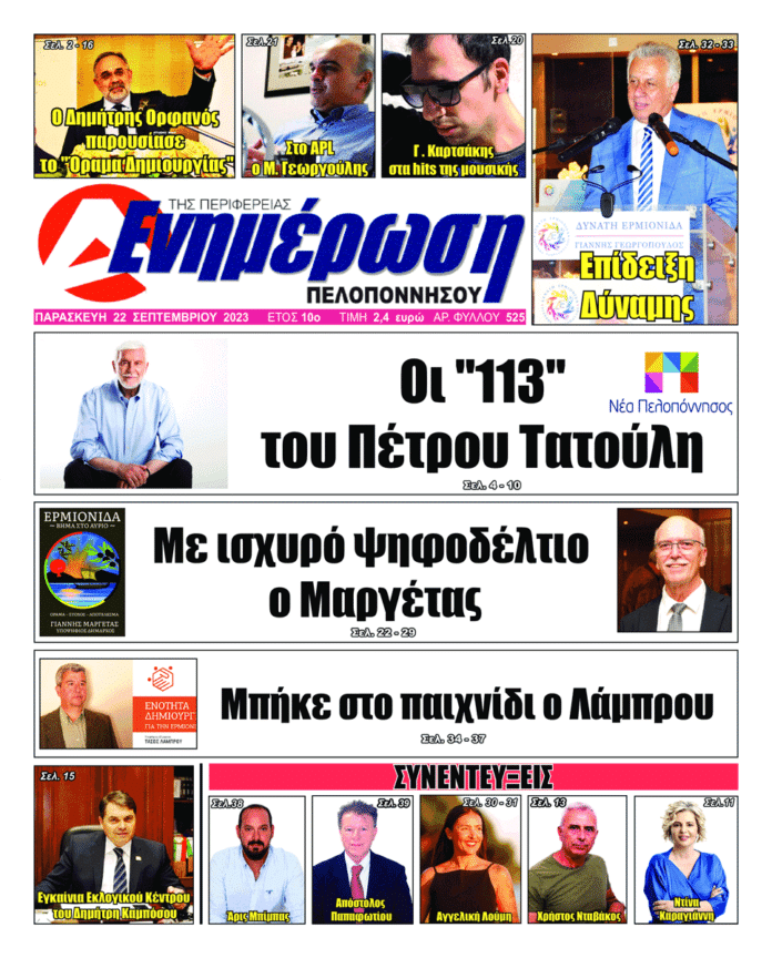 Πρωτοσέλιδα Πρωτοσέλιδο 22 Σεπτεμβρίου 2023 Από Ενημέρωση Πελοποννήσου 21 Σεπτεμβρίου 2023 FacebookTwitterViberWhatsApp Ακολουθήστε την Ενημέρωση Πελοποννήσου στο Facebook Αποκλειστικές Έρευνες – Συνεντεύξεις και ΆρθραΕιδήσεις από: Ναύπλιο – Άργος – Ερμιονίδα – Τρίπολη – Κορινθία – Αθλητικά – Γερανιός-2xalkidisfrontlabrou ΑΞΙΖΕΙ ΝΑ ΔΙΑΒΑΣΕΤΕ Featured 2 ΕΛΤΑ Αργολίδας: Κενές απαντήσεις και καμία δέσμευση από το Υπουργείο 17 Απριλίου 2026 Featured 2 Τριήμερο Θεατροπαιδαγωγικών δράσεων στο Ναύπλιο 17 Απριλίου 2026 Featured 2 “Σεληνιακό τοπίο” ο δρόμος Τρίπολης – Στεμνίτσας 17 Απριλίου 2026 Featured 2 Υπεύθυνες οι υπηρεσίες της Περιφέρειας για τον κάμπο των Διδύμων 17 Απριλίου 2026 Αργολίδα Ημερίδα στο Ναύπλιο: Σεξουαλική Κακοποίηση Ατόμων με Αναπηρία 17 Απριλίου 2026 Ελλάδα “Επείγουσα ανάγκη για μέτρα ενίσχυσης των ΑμεΑ” 17 Απριλίου 2026 Αργολίδα ΚΚΕ: Μεγάλη Εκδήλωση στο Ναύπλιο για την Ακροναυπλία 16 Απριλίου 2026 Αργολίδα Ημερίδα Επιμελητηρίου Αργολίδας: “Παράγουμε στην Ελλάδα” 16 Απριλίου 2026 Αργολίδα Γονίδια και Επιλογές: Εκδήλωση του ΚΕΣ στο Ναύπλιο για τη Γενετική 16 Απριλίου 2026 Τελευταίες ειδήσεις Αργολίδα Ημερίδα στο Ναύπλιο: Σεξουαλική Κακοποίηση Ατόμων με Αναπηρία 17 Απριλίου 2026 Ελλάδα “Επείγουσα ανάγκη για μέτρα ενίσχυσης των ΑμεΑ” 17 Απριλίου 2026 Αργολίδα ΚΚΕ: Μεγάλη Εκδήλωση στο Ναύπλιο για την Ακροναυπλία 16 Απριλίου 2026 Αργολίδα Ημερίδα Επιμελητηρίου Αργολίδας: “Παράγουμε στην Ελλάδα” 16 Απριλίου 2026 Αργολίδα Γονίδια και Επιλογές: Εκδήλωση του ΚΕΣ στο Ναύπλιο για τη Γενετική 16 Απριλίου 2026 Περιφέρεια 14 συλλήψεις σε Αργολίδα, Κορινθία & Λακωνία 16 Απριλίου 2026 Περιφέρεια Σοκαριστικά ευρήματα στον Πάρνωνα: 95 δηλητηριασμένα δολώματα και ένας νεκρός σκύλος 16 Απριλίου 2026 Αθλητισμός Ο παλμός του μπάσκετ χτυπά δυνατά στην Τρίπολη 16 Απριλίου 2026 Τα πιο δημοφιλη Υπεύθυνες οι υπηρεσίες της Περιφέρειας για τον κάμπο των Διδύμων Featured 2 17 Απριλίου 2026 Όταν ο Τόνι Πινέλι συνάντησε τον Δημήτρη Κουρούνη Άρθρα 17 Φεβρουαρίου 2020 ΕΛΤΑ Αργολίδας: Κενές απαντήσεις και καμία δέσμευση από το Υπουργείο Featured 2 17 Απριλίου 2026 Πανικόβλητος συκοφάντης ο Δήμαρχος Γεωργόπουλος Άρθρα 10 Απριλίου 2026 Μούχλι Αρκαδίας: Η εγκατάλειψη της ιστορικής καστροπολιτείας Αρκαδία 15 Απριλίου 2026 Αρχική σελίδα