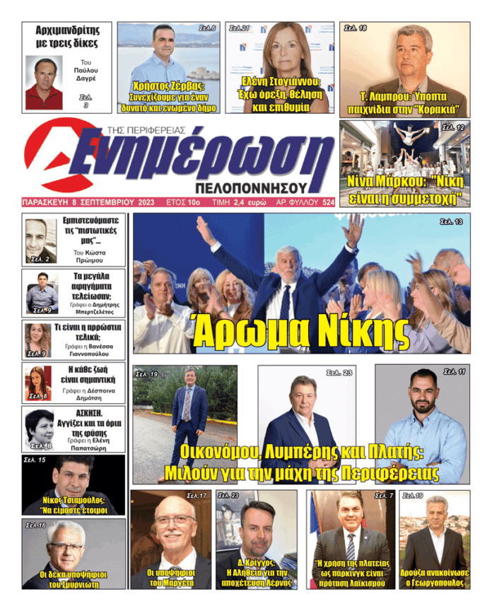 Πρωτοσέλιδα Πρωτοσέλιδο 8 Σεπτεμβρίου 2023 Από Ενημέρωση Πελοποννήσου 7 Σεπτεμβρίου 2023 FacebookTwitterViberWhatsApp Ακολουθήστε την Ενημέρωση Πελοποννήσου στο Facebook Αποκλειστικές Έρευνες – Συνεντεύξεις και ΆρθραΕιδήσεις από: Ναύπλιο – Άργος – Ερμιονίδα – Τρίπολη – Κορινθία – Αθλητικά – Γερανιός-2xalkidisfrontlabrou ΑΞΙΖΕΙ ΝΑ ΔΙΑΒΑΣΕΤΕ Featured 2 ΕΛΤΑ Αργολίδας: Κενές απαντήσεις και καμία δέσμευση από το Υπουργείο 17 Απριλίου 2026 Featured 2 Τριήμερο Θεατροπαιδαγωγικών δράσεων στο Ναύπλιο 17 Απριλίου 2026 Featured 2 “Σεληνιακό τοπίο” ο δρόμος Τρίπολης – Στεμνίτσας 17 Απριλίου 2026 Featured 2 Υπεύθυνες οι υπηρεσίες της Περιφέρειας για τον κάμπο των Διδύμων 17 Απριλίου 2026 Αργολίδα Ημερίδα στο Ναύπλιο: Σεξουαλική Κακοποίηση Ατόμων με Αναπηρία 17 Απριλίου 2026 Ελλάδα “Επείγουσα ανάγκη για μέτρα ενίσχυσης των ΑμεΑ” 17 Απριλίου 2026 Αργολίδα ΚΚΕ: Μεγάλη Εκδήλωση στο Ναύπλιο για την Ακροναυπλία 16 Απριλίου 2026 Αργολίδα Ημερίδα Επιμελητηρίου Αργολίδας: “Παράγουμε στην Ελλάδα” 16 Απριλίου 2026 Αργολίδα Γονίδια και Επιλογές: Εκδήλωση του ΚΕΣ στο Ναύπλιο για τη Γενετική 16 Απριλίου 2026 Τελευταίες ειδήσεις Αργολίδα Ημερίδα στο Ναύπλιο: Σεξουαλική Κακοποίηση Ατόμων με Αναπηρία 17 Απριλίου 2026 Ελλάδα “Επείγουσα ανάγκη για μέτρα ενίσχυσης των ΑμεΑ” 17 Απριλίου 2026 Αργολίδα ΚΚΕ: Μεγάλη Εκδήλωση στο Ναύπλιο για την Ακροναυπλία 16 Απριλίου 2026 Αργολίδα Ημερίδα Επιμελητηρίου Αργολίδας: “Παράγουμε στην Ελλάδα” 16 Απριλίου 2026 Αργολίδα Γονίδια και Επιλογές: Εκδήλωση του ΚΕΣ στο Ναύπλιο για τη Γενετική 16 Απριλίου 2026 Περιφέρεια 14 συλλήψεις σε Αργολίδα, Κορινθία & Λακωνία 16 Απριλίου 2026 Περιφέρεια Σοκαριστικά ευρήματα στον Πάρνωνα: 95 δηλητηριασμένα δολώματα και ένας νεκρός σκύλος 16 Απριλίου 2026 Αθλητισμός Ο παλμός του μπάσκετ χτυπά δυνατά στην Τρίπολη 16 Απριλίου 2026 Τα πιο δημοφιλη Υπεύθυνες οι υπηρεσίες της Περιφέρειας για τον κάμπο των Διδύμων Featured 2 17 Απριλίου 2026 Όταν ο Τόνι Πινέλι συνάντησε τον Δημήτρη Κουρούνη Άρθρα 17 Φεβρουαρίου 2020 ΕΛΤΑ Αργολίδας: Κενές απαντήσεις και καμία δέσμευση από το Υπουργείο Featured 2 17 Απριλίου 2026 Πανικόβλητος συκοφάντης ο Δήμαρχος Γεωργόπουλος Άρθρα 10 Απριλίου 2026 Μούχλι Αρκαδίας: Η εγκατάλειψη της ιστορικής καστροπολιτείας Αρκαδία 15 Απριλίου 2026 Αρχική σελίδα