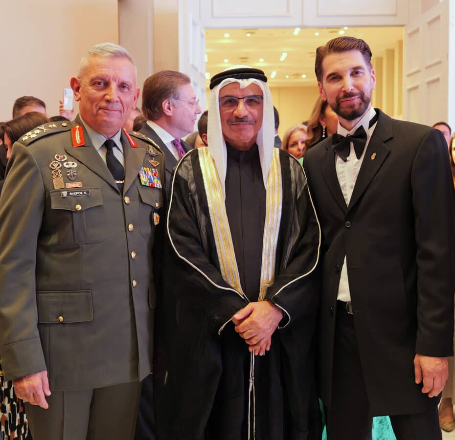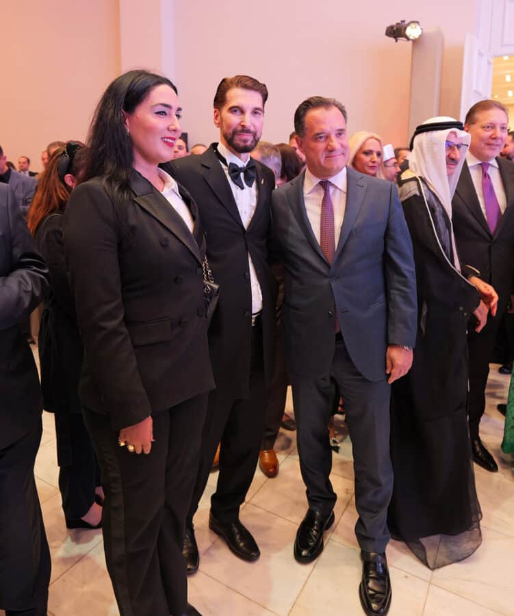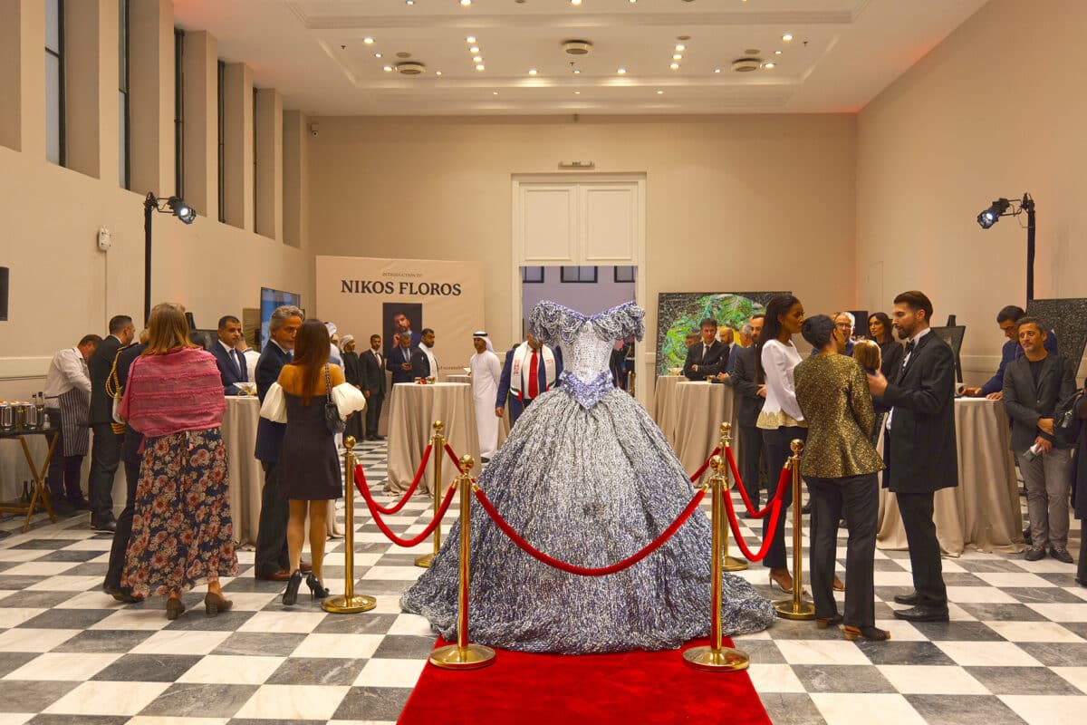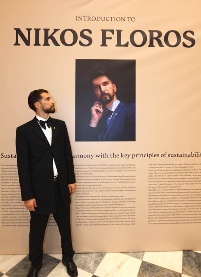 “Για πρώτη φορά η Πρεσβεία των Η.Α.Ε. ανοίγει τις πόρτες της στους υψηλούς της προσκεκλημένους οι οποίοι έχουν την ευκαιρία να δουν και να θαυμάσουν από κοντά μερικά από τα σημαντικότερα έργα του Έλληνα γλύπτη που βασίζονται σε μια ειδική τεχνική μετατροπής αλουμινίου σε πρωτότυπα έργα τέχνης, μοναδικά γλυπτά κοστούμια και πορτραίτα διάσημων προσωπικοτήτων.