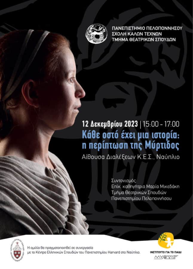 Το Τμήμα Θεατρικών Σπουδών του Πανεπιστημίου Πελοποννήσου σε συνεργασία με το Κέντρο Ελληνικών Σπουδών Ελλάδας (ΚΕΣ) του Πανεπιστημίου Harvard σας προσκαλούν στην ομιλία του καθηγητή κ. Μανώλη Παπαγρηγοράκη με τίτλο: «Κάθε οστό έχει μια ιστορία: η περίπτωση της Μύρτιδος» την Τρίτη 12 Δεκεμβρίου, στις 15:00 -17:00 μ.μ., στην αίθουσα Διαλέξεων ΚΕΣ, Ναύπλιο.