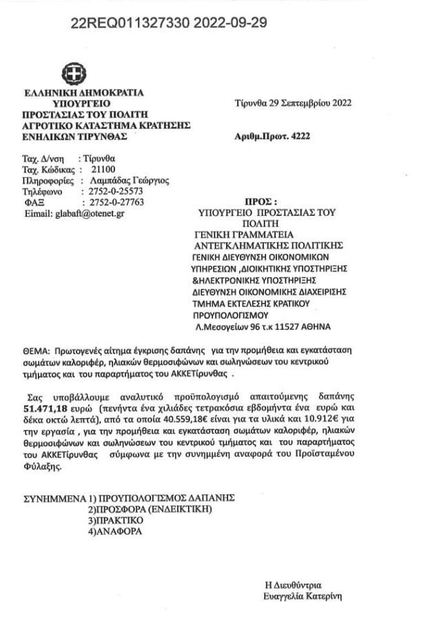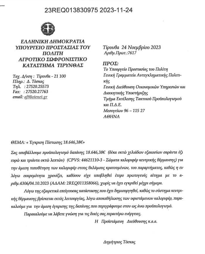 Παύλος Δαγρές: Προς προϊσταμένη Αγροτικών φυλακών Τίρυνθας