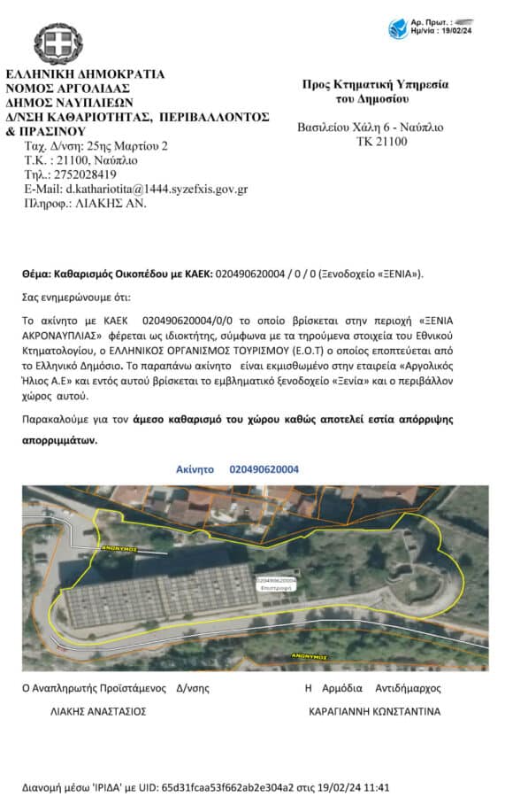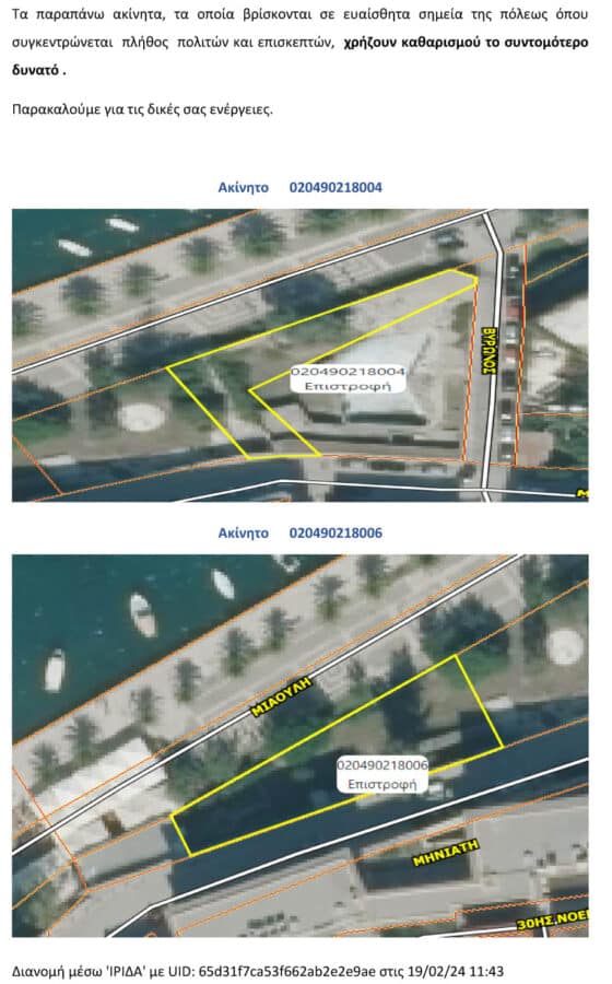 Συγκεκριμένα, έχουν σταλεί επιστολές προς την Κτηματική Υπηρεσία του Δημοσίου για το ακίνητο με ΚΑΕΚ 020490620004/0/0 το οποίο βρίσκεται στην περιοχή «ΞΕΝΙΑ ΑΚΡΟΝΑΥΠΛΙΑΣ», στα ακίνητα με ΚΑΕΚ 020494801090/0/0, 020494801091/0/0 και 020494801092/0/0 τα οποία βρίσκονται στην περιοχή «Καραθώνα», στα ακίνητα με ΚΑΕΚ 020490218004 και 020490218006/0/ τα οποία βρίσκονται έμπροσθεν της παραλίας Ναυπλίου, στο ύψος του Ξενοδοχείου «Αμφιτρύων», και στα ακίνητα με ΚΑΕΚ 020491109001/0/0, 0020491110001/0/0 και 020491001001/0/0 τα οποία βρίσκονται πλησίον του Ι. Ν. Αγίου Αναστασίου τα οποία βρίσκονται σε ευαίσθητα σημεία της πόλεως όπου συγκεντρώνεται πλήθος πολιτών και επισκεπτών, χρήζουν καθαρισμού το συντομότερο δυνατό.