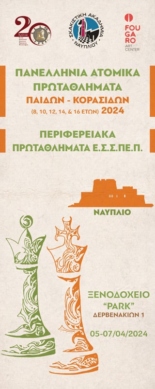 Η Ένωση Σκακιστικών Σωματείων Περιφέρειας Πελοποννήσου με την συνεργασία της Σκακιστικής Ακαδημίας Ναυπλίου διοργανώνει φέτος στο Ναύπλιο στο ξενοδοχείο ΠΑΡΚ, στις 5-7 Απριλίου τα Περιφερειακά Πρωταθλήματα Παίδων και Κορασίδων – προκριματικά για τα αντίστοιχα πανελλήνια πρωταθλήματα σκακιού.
