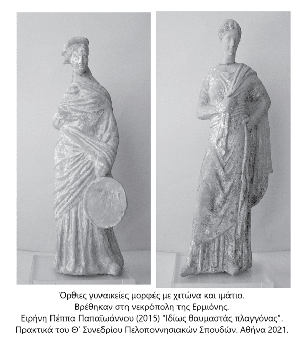 Τα πήλινα ειδώλια της ανασκαφής κυρίως του 4ου και 3ου αι. π.Χ., «θαυμασταί πλαγγόνες» όπως τα χαρακτήρισε ο Φιλαδελφεύς προσδιορίζοντας έτσι την καλλιτεχνική αξία αυτών των κτερισμάτων της νεκρόπολης της Ερμιόνης μαζί με τις κωδωνόσχημες πλαγγόνες και τα ειδώλια του 7ου και 5ου αι. π.Χ. αποτέλεσαν τη βάση της παρουσίασης του θέματος.
