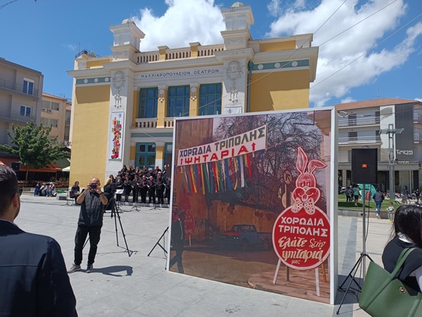 Μπροστά σε ένα από τη σημεία κατατεθέν της πόλης, στο Μαλλιαροπούλειο Θέατρο, τα μέλη της Χορωδίας Τρίπολης, ιδρυτικά μέλη αλλά και πολύ νεαρότερα, συγκίνησαν τους επισκέπτες του Πάσχα που συρρέουν κάθε χρόνο στην πόλη αλλά και τους ντόπιους που παραμένουν πιστοί στα έθιμα του τόπου τους.