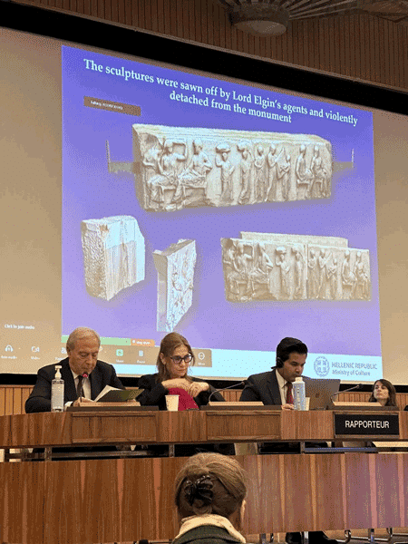 Με την ελληνική αντιπροσωπεία παρουσιάσαμε αναλυτικά και εμπεριστατωμένα όλο το ιστορικό της υπόθεσης καθώς και τις θέσεις της χώρας μας. Τονίσαμε εμφατικά την ανυπαρξία φιρμανιού και σχετικών σουλτανικών εγγράφων, καθώς και την παράνομη αφαίρεση των Γλυπτών από τον Λόρδο Έλγιν πριν καταλήξουν στο Βρετανικό Μουσείο, γεγονός το οποίο επιβεβαιώθηκε και από την τουρκική αντιπροσωπεία κατά την τοποθέτησή της. Τονίσαμε εκ νέου ότι τα Γλυπτά του Παρθενώνα και οι συμβολισμοί, που αυτά ενέχουν, αποτελούν αναπόσπαστο τμήμα της ελληνικής πολιτιστικής κληρονομιάς και της ελληνικής πολιτιστικής ταυτότητας.