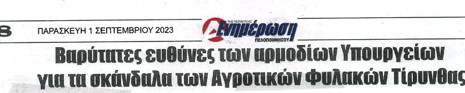Την πρώτη Σεπτεμβρίου 2023 δημοσιεύσαμε άρθρο με τίτλο: Βαρύτατες ευθύνες των αρμοδίων Υπουργείων για τα ΣΚΑΝΔΑΛΑ των Αγροτικών Φυλακών Τίρυνθας. Η Δ/νση της Αγροτικής Φυλακής Τίρυνθας με την ίδια Προϊσταμένη χρεώνει επί 10 χρόνια το Δημόσιο παρουσιάζοντας ζημία αντί κέρδους από την κτηνοτροφία. Καλούμε τους αρμόδιους του Υπουργείου «Προστασίας του Πολίτη» όπως ενεργήσουν άμεσα ώστε να διορθωθούν τα κακώς κείμενα στην Αγροτική Φυλακή Τίρυνθας.