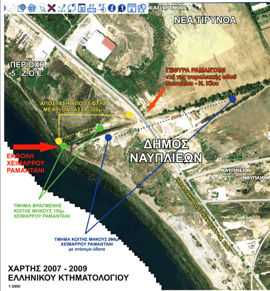 Γιώργος Πανοβράκος – Ντόκος: Τα συχνότερα και περισσότερα είναι από τον υπερχειλιστήρα του αγωγού άρδευσης του Ανάβαλου / Γ.Ο.Ε.Β. Λιγότερα είναι αυτά που ρίχνονται από το αντλιοστάσιο ύδρευσης της ΔΕΥΑΝ. Πέραν αυτών προ 5ετίας ρίχθηκαν επί 3μηνο τα νερά του Κεφαλαρίου, για να μην πλημμυρίσει η Νέα Κίος από τον Ερασίνο ποταμό. Τότε ήσαν τεράστιες οι ποσότητες νερού που πλημμύρισαν την περιοχή μας. Θυμάμαι για μήνες ήταν πλημμυρισμένα όλα τα χωράφια ανατολικά του παραλιακού δρόμου και όλη η παραλιακή έκταση από τον Ραμαντάνι μέχρι τα κτήρια της Περιφέρειας. Βόρεια του Ραμαντάνι είχαν πλημμυρίσει και τα χωράφια των Αγροτικών Φυλακών Τίρυνθας, σε όλη την περιοχή δυτικά του ξενοδοχείου Αμαλία.