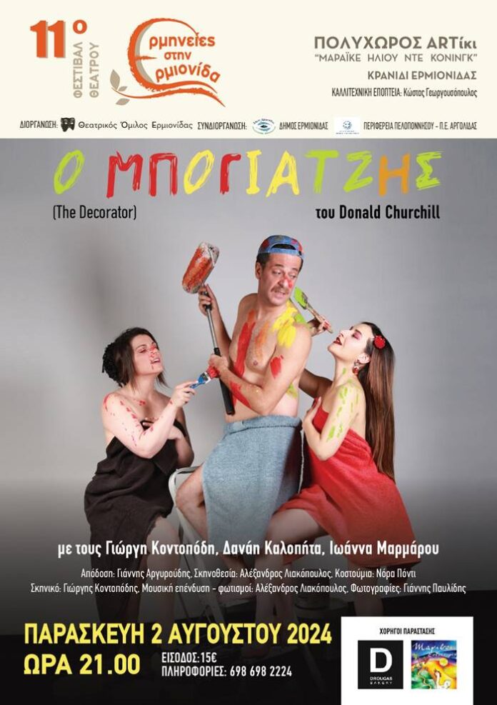 «O ΜΠΟΓΙΑΤΖΗΣ» στο 11ο Φεστιβάλ Θεάτρου «Ερμηνείες στην Ερμιονίδα». H σπαρταριστή κωμωδία του Donald Churchill “The Decorator” με τους Γιώργη Κοντοπόδη, Δανάη Καλοπήτα, Ιωάννα Μαρμάρου την Παρασκευή 2 Αυγούστου και ώρα 21.00, Θέατρο Αρτίκι Μαράικε Ηλιού Ντε Κόνινγκ, Κρανίδι.