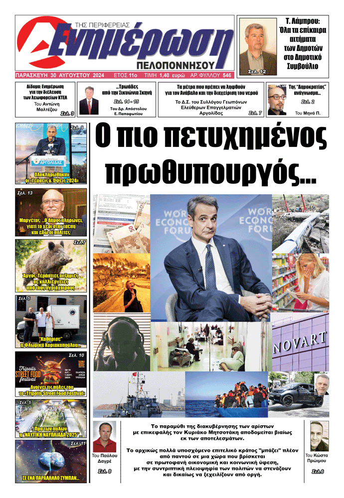 Πρωτοσέλιδα Πρωτοσέλιδο 30 Αυγούστου 2024 Από Ενημέρωση Πελοποννήσου 29 Αυγούστου 2024 FacebookTwitterViberWhatsApp Ακολουθήστε την Ενημέρωση Πελοποννήσου στο Facebook Αποκλειστικές Έρευνες – Συνεντεύξεις και ΆρθραΕιδήσεις από: Ναύπλιο – Άργος – Ερμιονίδα – Τρίπολη – Κορινθία – Αθλητικά – Γερανιός-2xalkidisfrontlabrou ΑΞΙΖΕΙ ΝΑ ΔΙΑΒΑΣΕΤΕ Featured 2 Αρκαδία: Επίσκεψη Τασούλα στην Έπαυλη του Ηρώδη Αττικού 19 Απριλίου 2026 Featured 2 Τελετή ορκωμοσίας – Executive MBA in Hotel Management 19 Απριλίου 2026 Featured 2 4ο Διεθνές Νεανικό Φεστιβάλ Αρχαίου Δράματος Κορίνθου 18 Απριλίου 2026 Featured 2 Τριήμερο Θεατροπαιδαγωγικών δράσεων στο Ναύπλιο 17 Απριλίου 2026 Περιφέρεια Συνεδρίαση της Πολιτικής Προστασίας Πελοποννήσου… 19 Απριλίου 2026 Αργολίδα Ημερίδα στο Ναύπλιο: Σεξουαλική Κακοποίηση Ατόμων με Αναπηρία 17 Απριλίου 2026 Αργολίδα ΕΛΤΑ Αργολίδας: Κενές απαντήσεις και καμία δέσμευση από το Υπουργείο 17 Απριλίου 2026 Περιφέρεια “Σεληνιακό τοπίο” ο δρόμος Τρίπολης – Στεμνίτσας 17 Απριλίου 2026 Άρθρα Υπεύθυνες οι υπηρεσίες της Περιφέρειας για τον κάμπο των Διδύμων 17 Απριλίου 2026 Τελευταίες ειδήσεις Περιφέρεια Συνεδρίαση της Πολιτικής Προστασίας Πελοποννήσου… 19 Απριλίου 2026 Αργολίδα Ημερίδα στο Ναύπλιο: Σεξουαλική Κακοποίηση Ατόμων με Αναπηρία 17 Απριλίου 2026 Αργολίδα ΕΛΤΑ Αργολίδας: Κενές απαντήσεις και καμία δέσμευση από το Υπουργείο 17 Απριλίου 2026 Περιφέρεια “Σεληνιακό τοπίο” ο δρόμος Τρίπολης – Στεμνίτσας 17 Απριλίου 2026 Άρθρα Υπεύθυνες οι υπηρεσίες της Περιφέρειας για τον κάμπο των Διδύμων 17 Απριλίου 2026 Ελλάδα “Επείγουσα ανάγκη για μέτρα ενίσχυσης των ΑμεΑ” 17 Απριλίου 2026 Αργολίδα ΚΚΕ: Μεγάλη Εκδήλωση στο Ναύπλιο για την Ακροναυπλία 16 Απριλίου 2026 Αργολίδα Ημερίδα Επιμελητηρίου Αργολίδας: “Παράγουμε στην Ελλάδα” 16 Απριλίου 2026 Τα πιο δημοφιλη Υπεύθυνες οι υπηρεσίες της Περιφέρειας για τον κάμπο των Διδύμων Άρθρα 17 Απριλίου 2026 Έλενα Χαραμή: Η λαϊκοδημοτική φωνή της Πελοποννήσου Συνεντεύξεις 17 Φεβρουαρίου 2025 Τελετή ορκωμοσίας – Executive MBA in Hotel Management Featured 2 19 Απριλίου 2026 “Λέμε την Αλήθεια στην Εξουσία” – 14ο Σεμινάριο Ελλάδα 4 Απριλίου 2026 Πανικόβλητος συκοφάντης ο Δήμαρχος Γεωργόπουλος Άρθρα 10 Απριλίου 2026 Αρχική σελίδα