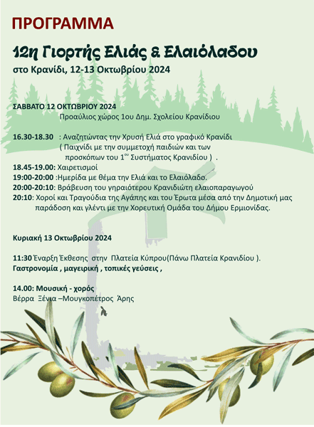 Αργολίδα Κρανίδι: 12η Γιορτή Ελιάς & Ελαιολάδου Από Ενημέρωση Πελοποννήσου 27 Σεπτεμβρίου 2024 FacebookTwitterViberWhatsApp Ακολουθήστε την Ενημέρωση Πελοποννήσου στο Facebook Αποκλειστικές Έρευνες – Συνεντεύξεις και ΆρθραΕιδήσεις από: Ναύπλιο – Άργος – Ερμιονίδα – Τρίπολη – Κορινθία – Αθλητικά – Γερανιός-2xalkidisfrontlabrou TagsΕρμιονίδαΚρανίδι ΑΞΙΖΕΙ ΝΑ ΔΙΑΒΑΣΕΤΕ Featured 2 Αρκαδία: Επίσκεψη Τασούλα στην Έπαυλη του Ηρώδη Αττικού 19 Απριλίου 2026 Featured 2 Τελετή ορκωμοσίας – Executive MBA in Hotel Management 19 Απριλίου 2026 Featured 2 4ο Διεθνές Νεανικό Φεστιβάλ Αρχαίου Δράματος Κορίνθου 18 Απριλίου 2026 Featured 2 Τριήμερο Θεατροπαιδαγωγικών δράσεων στο Ναύπλιο 17 Απριλίου 2026 Περιφέρεια Συνεδρίαση της Πολιτικής Προστασίας Πελοποννήσου… 19 Απριλίου 2026 Αργολίδα Ημερίδα στο Ναύπλιο: Σεξουαλική Κακοποίηση Ατόμων με Αναπηρία 17 Απριλίου 2026 Αργολίδα ΕΛΤΑ Αργολίδας: Κενές απαντήσεις και καμία δέσμευση από το Υπουργείο 17 Απριλίου 2026 Περιφέρεια “Σεληνιακό τοπίο” ο δρόμος Τρίπολης – Στεμνίτσας 17 Απριλίου 2026 Άρθρα Υπεύθυνες οι υπηρεσίες της Περιφέρειας για τον κάμπο των Διδύμων 17 Απριλίου 2026 Τελευταίες ειδήσεις Περιφέρεια Συνεδρίαση της Πολιτικής Προστασίας Πελοποννήσου… 19 Απριλίου 2026 Αργολίδα Ημερίδα στο Ναύπλιο: Σεξουαλική Κακοποίηση Ατόμων με Αναπηρία 17 Απριλίου 2026 Αργολίδα ΕΛΤΑ Αργολίδας: Κενές απαντήσεις και καμία δέσμευση από το Υπουργείο 17 Απριλίου 2026 Περιφέρεια “Σεληνιακό τοπίο” ο δρόμος Τρίπολης – Στεμνίτσας 17 Απριλίου 2026 Άρθρα Υπεύθυνες οι υπηρεσίες της Περιφέρειας για τον κάμπο των Διδύμων 17 Απριλίου 2026 Ελλάδα “Επείγουσα ανάγκη για μέτρα ενίσχυσης των ΑμεΑ” 17 Απριλίου 2026 Αργολίδα ΚΚΕ: Μεγάλη Εκδήλωση στο Ναύπλιο για την Ακροναυπλία 16 Απριλίου 2026 Αργολίδα Ημερίδα Επιμελητηρίου Αργολίδας: “Παράγουμε στην Ελλάδα” 16 Απριλίου 2026 Τα πιο δημοφιλη Υπεύθυνες οι υπηρεσίες της Περιφέρειας για τον κάμπο των Διδύμων Άρθρα 17 Απριλίου 2026 Έλενα Χαραμή: Η λαϊκοδημοτική φωνή της Πελοποννήσου Συνεντεύξεις 17 Φεβρουαρίου 2025 Τελετή ορκωμοσίας – Executive MBA in Hotel Management Featured 2 19 Απριλίου 2026 Το πέρασμα στην εποχή των ισχνών αγελάδων Άρθρα 19 Απριλίου 2026 6ο Σύνταγμα Πεζικού – Χειμάρρα Κορινθία 30 Οκτωβρίου 2019 Αρχική σελίδα