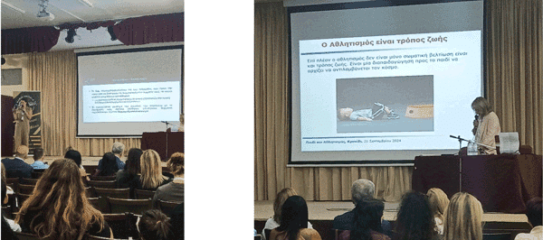 • «Ο αθλητισμός στις αναπτυξιακές ηλικίες» από τον κ. Φουντούκη Αναστάσιο, Γενικό Γραμματέα της ΕΑΣ ΣΕΓΑΣ Περιφέρειας Πελοποννήσου και Εκπαιδευτικό. Παρουσιάστηκαν τα οφέλη, η φυσική δραστηριότητα, η άσκηση, η άθληση, τα ταλέντα.